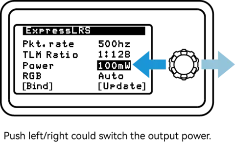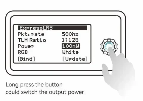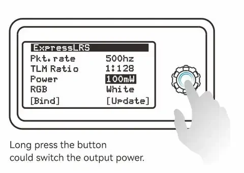 Micro RF TX module could switch the output power via ELRS.lua script, as description in "LUA Script" chapter.Besides, using the button and OLED, move to the Output position. Long press the button could switch the output power.