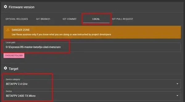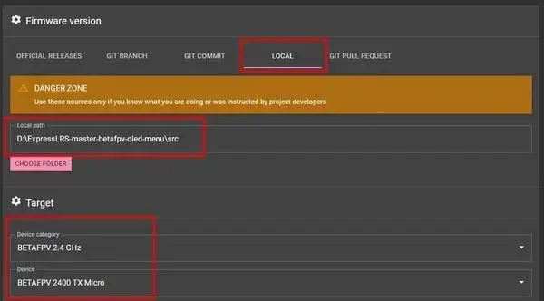 Second, open the ExpressLRS Configurator and load the upzip source code from local. Select the target device ''BETAFPV 900/2400 TX Micro''. Now, you could setup your own binding phrase and other options as normal.