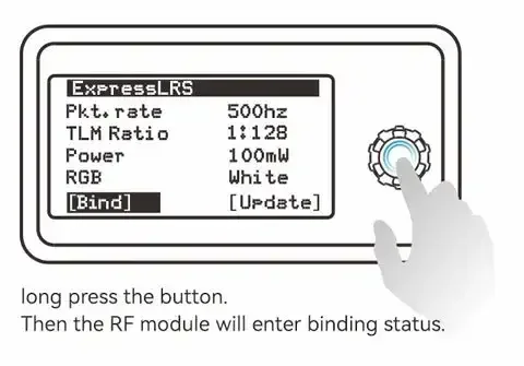 The Micro RF TX module comes with offically major release V1.1.0 protocol and no Binding Phrase inlcuded. So please make sure the receiver works on offically major release V1.0.0~V1.1.0 protocol. And no Binding Phrase setted. Micro RF TX module could enter binding status via ELRS.lua script, as description in "LUA Script" chapter. Besides, using the button and OLED, move to the BIND position and long press the button. Then the RF module will enter binding status.