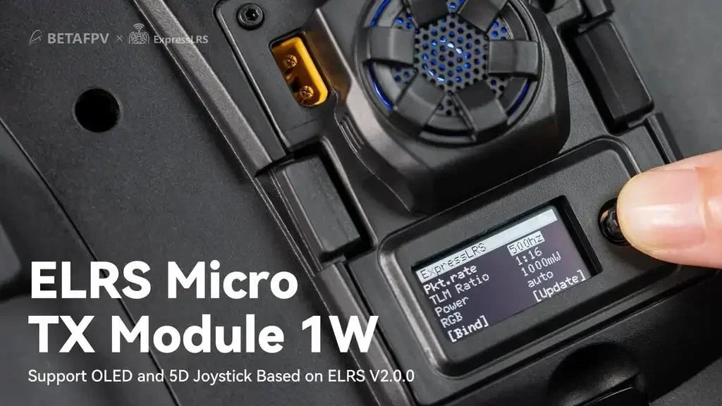 The black version with maximum 1W RF output power is released now. Support all 5D button dimensions based on BETAFPV ELRS V2.0.0 firmware. A new backpack function is added, allowing wireless communication between ExpressLRS, and other FPV related devices for command and control, or for querying config.