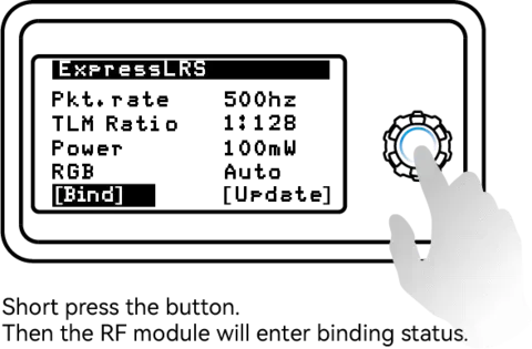 The Micro RF TX module comes with officially major release V1.1.0 or V2.0.0 protocol and no Binding Phrase included. So please make sure the receiver works on officially major release V1.0.0~V1.1.0 or V2.0.0 protocol. And no Binding Phrase set. Micro RF TX module could enter binding status via ELRS.lua or ELRSV2.lua script, as described in ''LUA Script'' chapter. Besides, using the button and OLED, move to the BIND position and long-press the button. Short press the button if it is V2.0.0. Then the RF module will enter binding status.