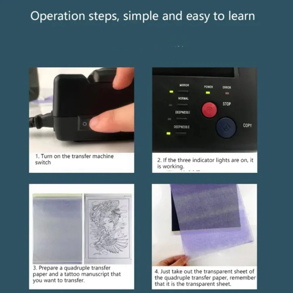 1.The ideal choice for tattoo artists: a professional copier designed specifically for tattoo enthusiasts, allowing you to quickly and effectively copy designs onto template paper in just a few simple steps. Greatly improve work efficiency.